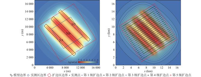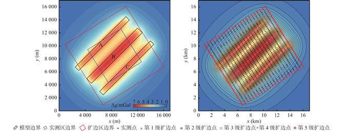 1 parameter can be selected for other levels of expanding. In the application of actual data edge expanding of LY block in west of Yin’e basin, the “three–step method” can be used for interpolation to jointly consider the external expanding and internal interpolation parameters. The expanding results show that the gravity anomaly at the junction of the expanding area and the measured area is continuous and smooth, and the expanding area better reflects the main strike and local variation characteristics of the anomaly.