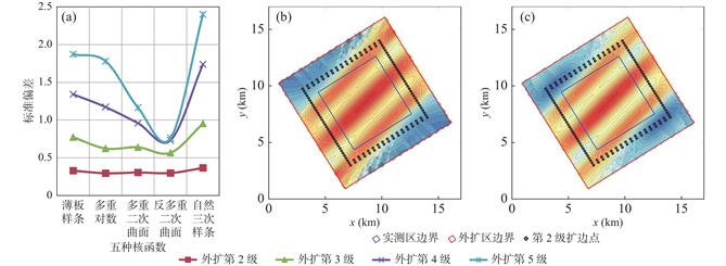 In order to study the edge expanding interpolation method considering the variation characteristics of gravity anomaly, we used 1∶50000 gravity data obtained from theoretical gravity anomaly simulation for research. Through the comparison of 7 interpolation methods in surfer software, it is considered that the radial basis function method can obtain better results in data expanding. On this basis, the idea of step by step iterative interpolation is proposed and the expanding parameters are optimized as follows: ① The kernel function is multiquadric function, ② The number of sectors to research is 4, ③ The maximum number of data to use from all sectors is 64, ④ The search radius R1/R2=6/18, and the radius R2 parallels to the main strike of the anomaly, ⑤ The search angle was selected when the search radius R2 is parallels to the main strike of the anomaly, ⑥ The R2 parameter is generally between 0 and 1, among them, R2 parameter is selected according to the residual error comparison results of boundary points when expanding for the first time, and 0.