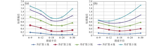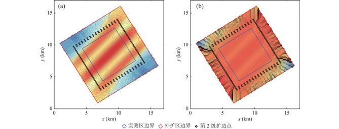 为了研究考虑异常变化特征的扩边插值方法,笔者使用理论重力异常模拟提取的1∶5万重力数据进行研究。通过Surfer软件中7种插值方法的比较,认为径向基函数法在数据扩边时能够获得较好的结果。在此基础上,笔者提出逐级迭代插值的思路并优选扩边参数如下:①核函数为多重二次曲面核函数。②搜索扇区为4个。③搜索点数为64个。④搜索半径R1/R2为6/18,且R2平行于异常整体走向。⑤搜索角度选为当搜索半径长轴R2平行于异常走向时的角度。⑥R2参数一般为0~1。其中,首次扩边时R2参数根据边界点残差对比结果选定,其余各级扩边时R2参数选0.1即可。银额盆地西部LY区块实际资料扩边应用时,采用“三步法”进行插值能够将外扩与内插参数联合考虑,扩边结果显示扩边区与实测区衔接处的重力异常连续光滑,扩边区较好的反映了异常整体趋势和局部变化特征。